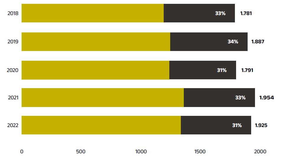 Evolució de les patents de Catalunya, Estat espanyol i països de l’EPO i resta de països del món, entre 2018 i 2022. Font: EPO