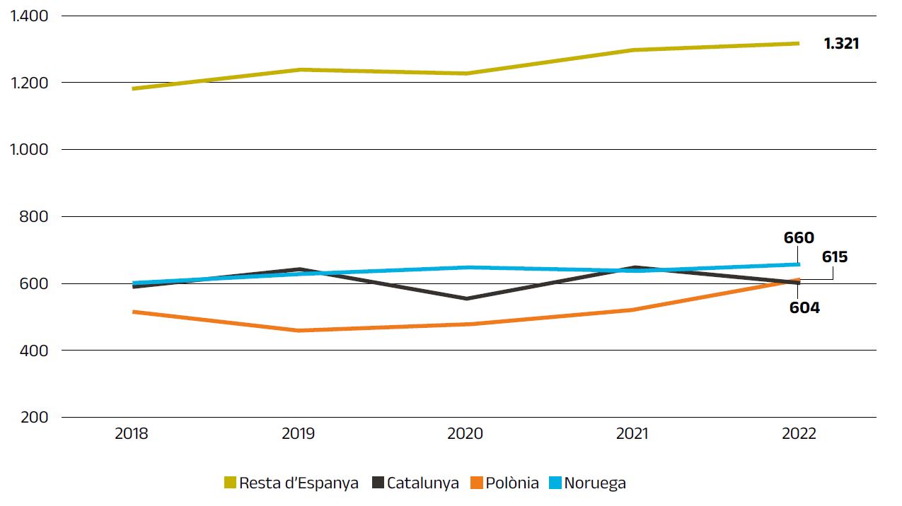 Per tal de poder fer una anàlisi comparativa consultem el nombre de patents sol·licitades pels 25 països amb més entrades a l’EPO l’any 2022. Catalunya que en va presentar 604 l’any 2022, ocuparia una posició similar a Polònia i Noruega, països que ocupen les posicions 24 i 25.